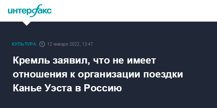 Москва. 12 января. INTERFAX.RU - Кремль не занимается организацией поездки американского исполнителя Канье Уэста в Россию, заявил пресс-секретарь президента РФ Дмитрий Песков, комментируя информацию о планах артиста встретиться с главой российского государства.