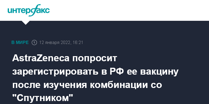Москва. 12 января. INTERFAX.RU - Британско-шведская компания AstraZeneca обратится в Минздрав России для регистрации своей вакцины от коронавируса COVID-19 после того, как получит данные по результатам клинических исследований её комбинации со "Спутником Лайт".