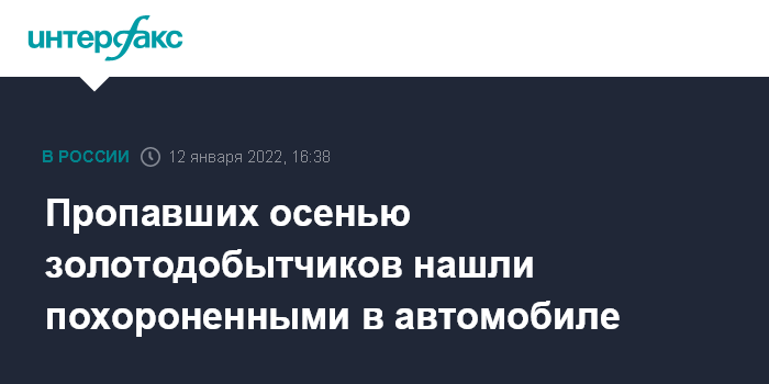 Москва. 12 января. INTERFAX.RU - В Якутии двух мужчин, которые пропали в октябре, нашли мертвыми в автомобиле, затопленном в подземной ручье, сообщили в СК. По факту возбуждено уголовное дело. Источник РЕН ТВ сообщил, что это были нелегальные золотодобытчики.