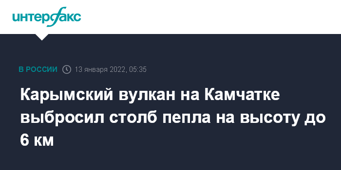 Москва. 13 января. INTERFAX.RU - Вулкан Карымский на Камчатке в четверг выбросил столб пепла на высоту до 6 км над уровнем моря, сообщает пресс-служба ГУ МЧС региона со ссылкой на Камчатскую группу реагирования на вулканические извержения (KVERT) института вулканологии и сейсмологии Дальневосточного отделения РАН.