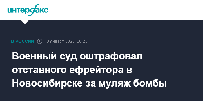 Москва. 13 января. INTERFAX.RU - Новосибирский гарнизонный военный суд оштрафовал на 50 тыс. рублей ефрейтора запаса Никиту Корепова за муляж взрывного устройства, говорится в материалах суда.