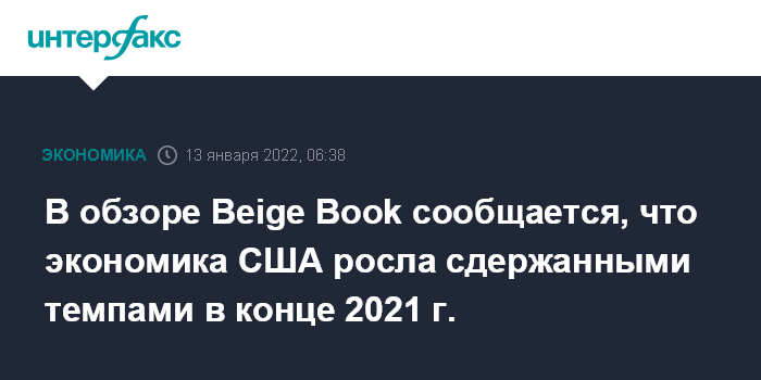Москва. 13 января. INTERFAX.RU - Экономическая активность в США росла сдержанными (modest) темпами в конце 2021 года, сообщается в опубликованном в среду Федеральной резервной системой региональном обзоре, который по цвету обложки называют Beige Book ("Бежевая книга").