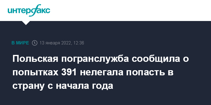 Москва. 13 января. INTERFAX.RU - За минувшие сутки в Польше зафиксировали 16 нелегальных мигрантов, стремившихся попасть в ЕС с территории Белоруссии, с начала года их количество достигло 391, сообщила польская Погранслужба в твиттере в четверг.