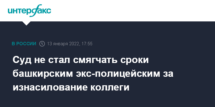 Москва. 13 января. INTERFAX.RU - Суд оставил без изменения обвинительный приговор трем бывшим высокопоставленным полицейским из Башкирии, осужденным за изнасилование коллеги, сообщила в четверг пресс-служба регионального СУ СКР.