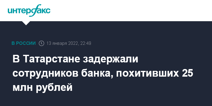 "Злоумышленники в Набережных Челнах совершили хищение из банковской организации вверенных им денежных средств на общую сумму 25 млн рублей в период с 3 декабря по 30 декабря 2021 года", - говорится в сообщении.