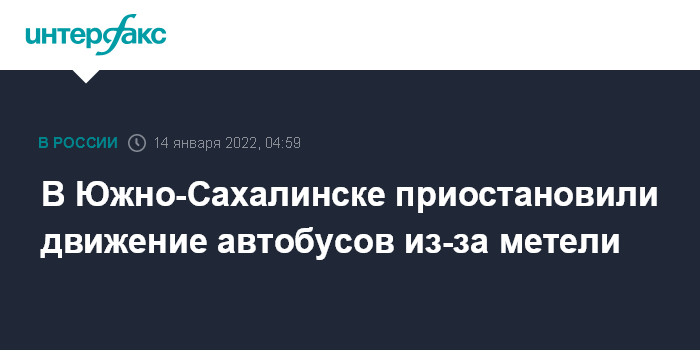Москва. 14 января. INTERFAX.RU - Автобусное сообщение приостанавливается днем в пятницу в Южно-Сахалинске из-за метели, сообщает пресс-служба мэрии.