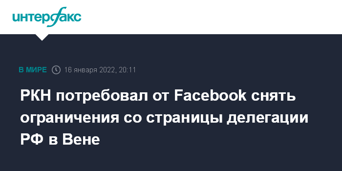 По данным РКН, ранее администрация Facebook якобы за публикацию запрещенного контента ограничила доступ к официальной странице делегации РФ на переговорах в Вене по вопросам военной безопасности и контроля над вооружениями, созданной Министерством иностранных дел России.