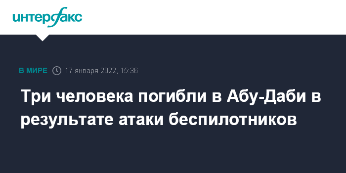 Москва. 17 января. INTERFAX.RU - Неизвестные совершили атаку, вероятно, при помощи беспилотников в ОАЭ, в результате которой погибли три человека, а еще шестеро ранены, сообщает Associated Press.