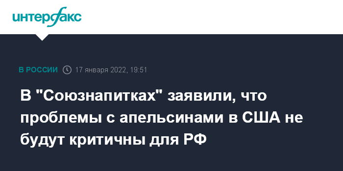 Москва. 17 января. INTERFAX.RU - Проблемы производителей апельсинов в США, приведшие к резкому росту фьючерсов на концентрат апельсинового сока, не будут критичны для российского рынка, считает президент Союза производителей соков, воды и напитков (Союзнапитки) Максим Новиков.