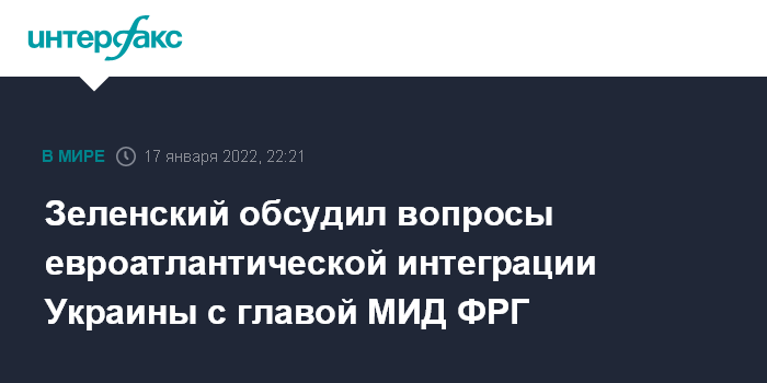 Москва. 17 января. INTERFAX.RU - Президент Украины Владимир Зеленский в понедельник провел в Киеве встречу с федеральным министром иностранных дел Германии Анналеной Бербок, сообщает пресс-служба главы государства.
