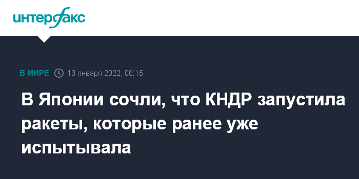 Москва. 18 января. INTERFAX.RU - Министерство обороны Японии считает, что Северная Корея в понедельник запустила твердотопливные баллистические ракеты малой дальности, которые уже испытывала ранее.