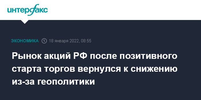 Рынок акций РФ после позитивного старта торгов вернулся к снижению из-за геополитики