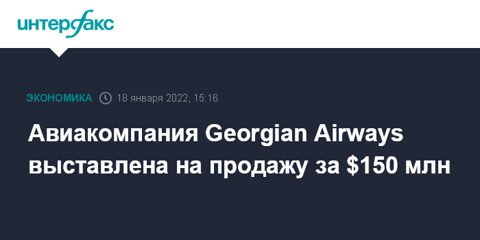 Москва. 18 января. INTERFAX.RU - Авиакомпания Georgian Airways ("Грузинские авиалинии") выставлена на продажу за $150 млн, сообщило объединение Georgian Business Brokerage, которое возглавляет бывший гендиректор авиаперевозчика Роман Бокерия.