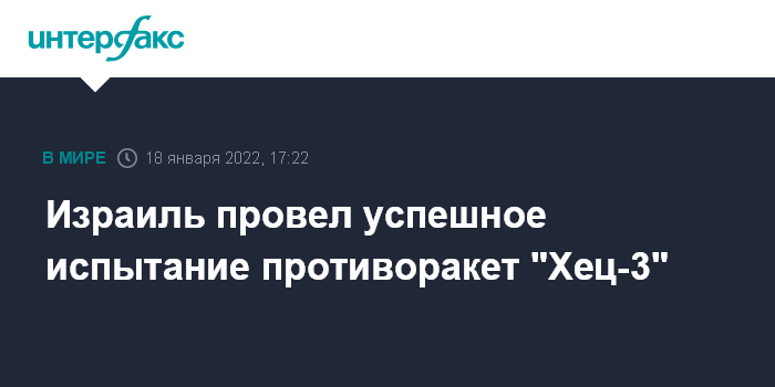 Москва. 18 января. INTERFAX.RU - В Израиле во вторник проведено успешное испытание по перехвату воздушной цели с использованием ракеты "Хец-3" ("Стрела-3"), сообщила The Jerusalem Post.