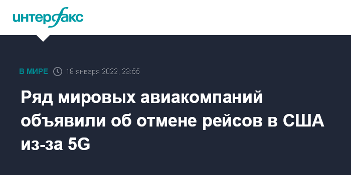 Москва. 18 января. INTERFAX.RU - Некоторые мировые авиакомпании объявили об отмене со среды рейсов в часть аэропортов США из-за опасений, что разворачиваемые там сети 5G могут создать помехи в работе критически важных приборов самолетов. Об этом сообщает CNN.