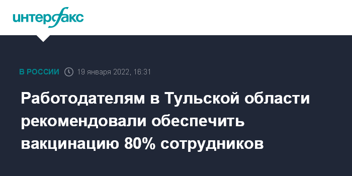 Москва. 19 января. INTERFAX.RU - Власти Тульской области для достижения коллективного иммунитета рекомендовали работодателям обеспечить вакцинацию не менее 80% сотрудников.