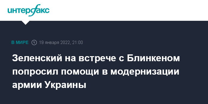 Москва. 19 января. INTERFAX.RU - Президент Украины Владимир Зеленский в среду провел встречу с государственным секретарем США Энтони Блинкеном, в ходе которой стороны обсудили евроатлантические стремления Украины.