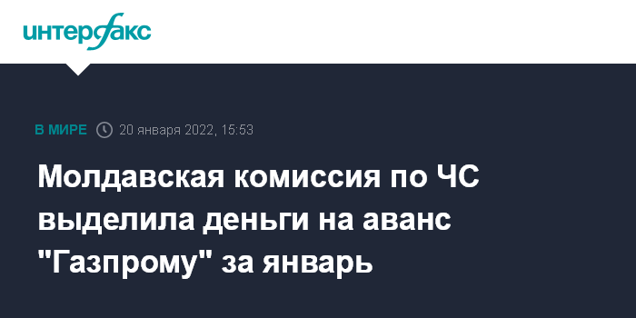 Москва. 20 января. INTERFAX.RU - Комиссия по чрезвычайным ситуациям в Молдавии выделила деньги "Молдовагазу" для выплаты "Газпрому" в полном объеме аванса за январь, сообщила "Интерфаксу" пресс-служба правительства.