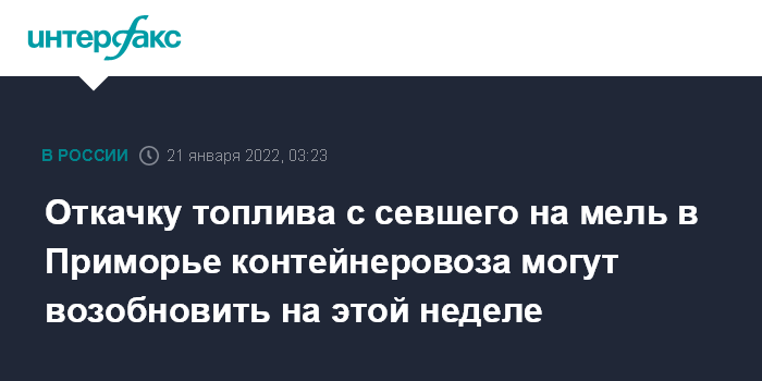 Москва. 21 января. INTERFAX.RU - Работы по откачке топлива с севшего осенью на мель у берегов Приморья контейнеровоза Rise Shine под флагом Панамы могут возобновить в конце этой недели, сообщила в пятницу пресс-служба администрации города Находка.