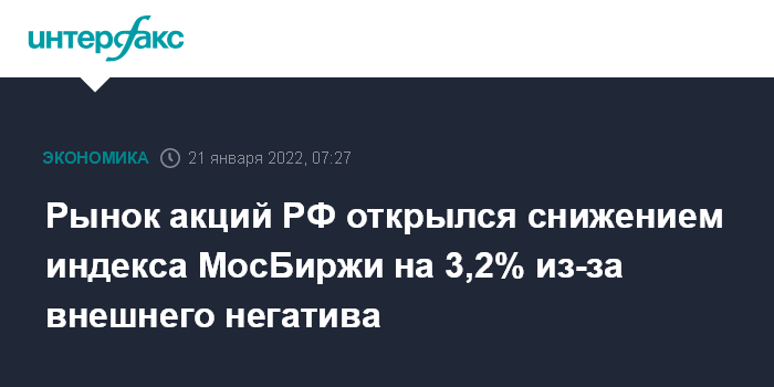 Москва. 21 января. INTERFAX.RU - Рынок акций РФ открылся в пятницу заметным снижением цен blue chips после коррекционного роста накануне на фоне ухудшения ситуации на мировых рынках капитала, в том числе на нефтяных площадках; индекс МосБиржи в начале торгов потерял почти 3,2%.
