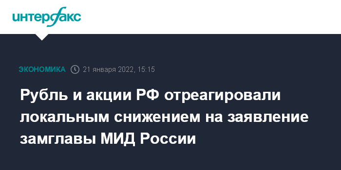 Москва. 21 января. INTERFAX.RU - Российский рубль и акции отреагировали локальным снижением на заявление замглавы МИД РФ Сергея Рябкова о том, что Россия будет вынуждена предпринять серьезные политические решения, если ответ США и НАТО по гарантиям безопасности будет разочаровывающим. Но спустя несколько минут рынок отыграл обратно вверх.