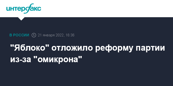 Москва. 21 января. INTERFAX.RU - "Яблоко" из-за всплеска заболеваемости COVID-19 в Москве отложило съезд, на котором планировалось изменение партии ради ее реформы. Об этом сообщила пресс-служба партии.