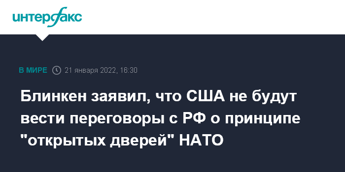 "Очень важно быть взаимно откровенным о вещах, на которые мы не пойдем, и одной из них является то, что мы не будем пересматривать фундаментальные принципы, которые у нас есть и которые мы будем защищать. Одним из них является принцип "открытых дверей" НАТО", - сказал Блинкен на пресс-конференции.