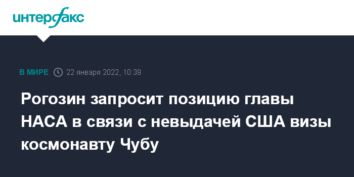 Москва. 22 января. INTERFAX.RU - Руководитель госкорпорации "Роскосмос" Дмитрий Рогозин обратится к главе НАСА в связи с отказом США в выдаче визы космонавту Николаю Чубу, который направлялся в Космический центр Линдона Джонсона для участия в тренировках.
