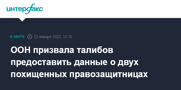 Москва. 22 января. INTERFAX.RU - Миссия ООН по содействию Афганистану (МООНСА) призвала захватившее Афганистан движения "Талибан" (запрещенная в России террористическая организация) предоставить информацию о похищенных в Кабуле двух правозащитницах.
