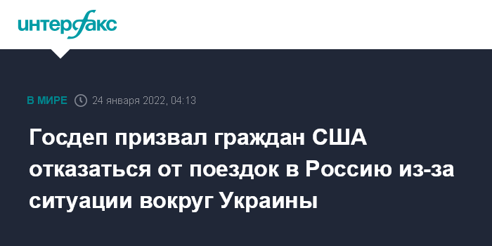 Москва. 24 января. INTERFAX.RU - Госдепартамент США настоятельно рекомендовал американцам отказаться от посещения России из-за украинского кризиса, "преследования со стороны российских спецслужб", ограниченных возможностей посольства в РФ по защите интересов американских граждан, а также коронавируса.