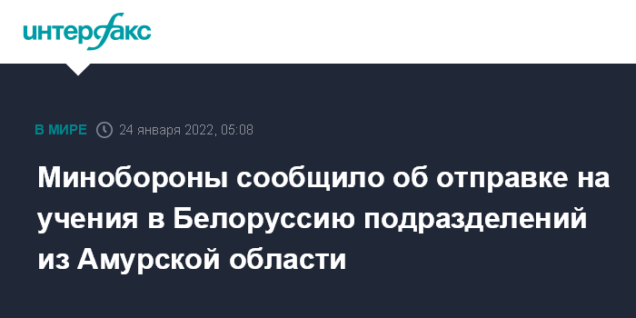 Москва. 24 января. INTERFAX.RU - Подразделения из Амурской области отправлены на учения в Белоруссию, где им предстоит выполнить учебные задачи на незнакомых полигонах.