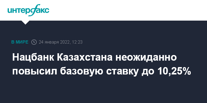Москва. 24 января. INTERFAX.RU - Национальный банк Казахстана сообщил, что решил повысить базовую ставку с 9,75% до 10,25% годовых с процентным коридором плюс-минус 1 процентный пункт (п.п.).