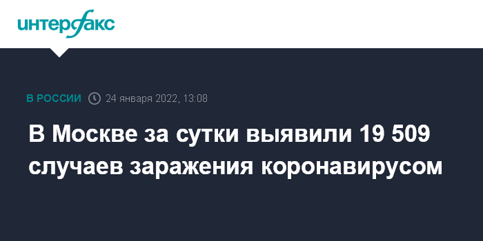 Москва. 24 января. INTERFAX.RU - В Москве установлен новый антирекорд суточного прироста заболеваемости COVID-19 - 19 509 новых случаев заражения за сутки, сообщил региональный оперштаб. Умер за сутки 71 человек с коронавирусом.