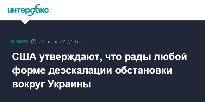 Москва. 24 января. INTERFAX.RU - В Вашингтоне готовы приветствовать любой из вариантов деэскалации напряженности на границе России и Украины, заявил в понедельник на брифинге представитель Госдепартамента Нед Прайс.