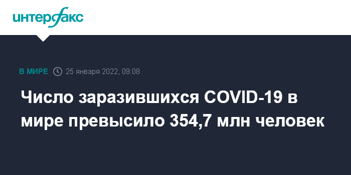 Москва. 25 января. INTERFAX.RU - Число зарегистрированных случаев заражения коронавирусом COVID-19 в мире на утро вторника достигло 354 788 076, свидетельствуют данные американского университета Джонса Хопкинса.