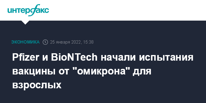 Москва. 25 января. INTERFAX.RU - Компании Pfizer и BioNTech сообщили, что начали клинические испытания своей вакцины от штамма коронавируса "омикрон" для лиц в возрасте от 18 до 55 лет. В рамках исследования будет проверена эффективность, безопасность и переносимость препарата у здоровых взрослых.