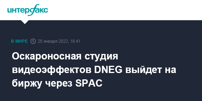 Москва. 25 января. INTERFAX.RU - Британская студия визуальных эффектов DNEG выйдет на открытый рынок через слияние со специализированной компанией по слияниям и поглощениям (SPAC) Sports Ventures Acquisition Corp. в рамках сделки объемом $1,6 млрд, пишет The Wall Street Journal.