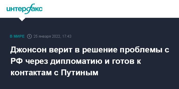 Москва. 25 января. INTERFAX.RU - Премьер Великобритании Борис Джонсон заверил, что считает возможным решение проблем с Россией при помощи диалога. Он выразил готовность продолжить контакты с президентом РФ Владимиром Путиным.