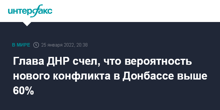 Москва. 25 января. INTERFAX.RU - Пока резкого увеличения числа обстрелов в Донбассе не наблюдается, но вероятность нового конфликта выше 60%, заявил глава самопровозглашенной Донецкой народной республики Денис Пушилин.