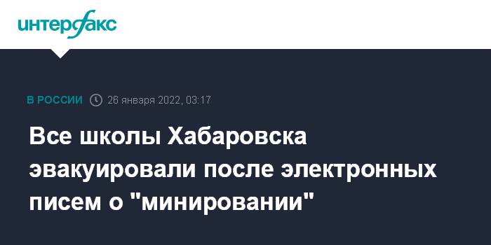 Москва. 26 января. INTERFAX.RU - Учеников и персонал всех школ Хабаровска вновь пришлось эвакуировать из-за сообщений о минировании, сообщает пресс-служба мэрии в среду.