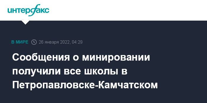 Москва. 26 января. INTERFAX.RU - Сообщения о минировании поступили утром в среду в школы Петропавловска-Камчатского, учащиеся и педагоги эвакуированы, сообщает пресс-служба правительства Камчатского края.