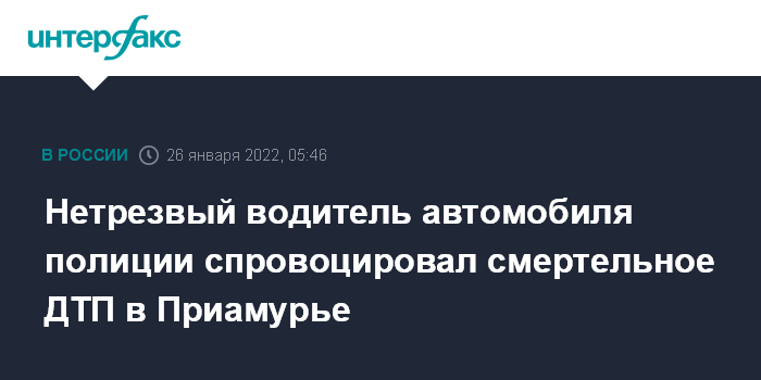Москва. 26 января. INTERFAX.RU - Сотрудница полиции погибла в автоаварии на федеральной трассе Чита - Хабаровск в Амурской области, которую спровоцировал нетрезвый водитель служебного автомобиля, сообщает региональная прокуратура, которая проводит проверку по факту дорожно-транспортного происшествия.