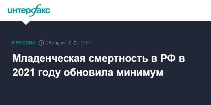 Москва. 26 января. INTERFAX.RU - Младенческая смертность в России в 2021 году снизилась до нового минимума в 4,4 смерти на тысячу детей, родившихся живыми, заявил в среду глава Минздрава РФ Михаил Мурашко.