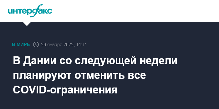 Москва. 26 января. INTERFAX.RU - Министерство здравоохранения Дании предложило со следующей недели снять все оставшиеся ограничения в рамках борьбы с COVID-19, сообщает в среду The Guardian.