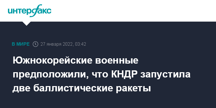 Москва. 27 января. INTERFAX.RU - Северная Корея выпустила, предположительно, две баллистические ракеты малой дальности в направлении Японского моря, сообщает в четверг агентство "Ренхап" со ссылкой на военных Южной Кореи.
