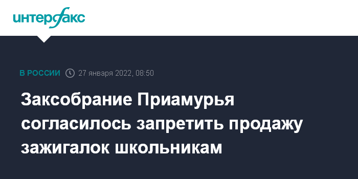 Москва. 27 января. INTERFAX.RU - Депутаты заксобрания Амурской области поддержали законопроект о запрете продавать детям товары со сжиженным газом - зажигалок и газовых баллончиков, сообщила пресс-служба парламента региона.