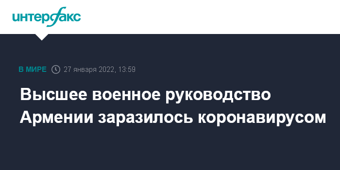 Москва. 27 января. INTERFAX.RU - Коронавирусная инфекция диагностирована у главы Генерального штаба (ГШ) Армении и высокопоставленных должностных лиц ГШ, сообщили "Интерфаксу" в министерстве обороны республики.