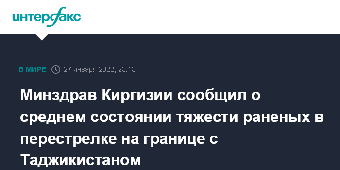 Москва. 27 января. INTERFAX.RU - Состояние раненных в ходе перестрелки на киргизско-таджикской границе оценивается как средней тяжести, сообщили в пятницу "Интерфаксу" в Минздраве Киргизии.