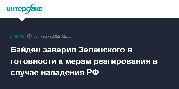 Москва. 28 января. INTERFAX.RU - Президент США Джо Байден провел телефонный разговор с украинским лидером Владимиром Зеленским, сообщает Белый дом.