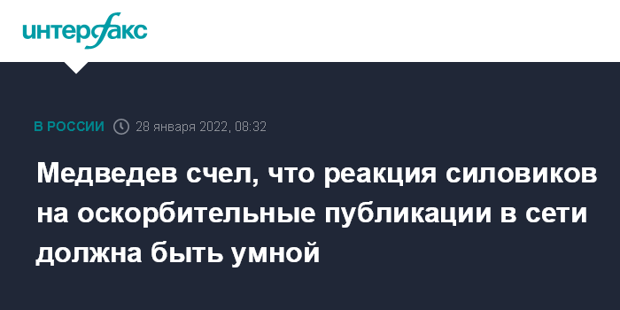Москва. 28 января. INTERFAX.RU - Зампред Совбеза РФ Дмитрий Медведев заявил, что реакция правоохранительных органов на оскорбительные публикации в интернете должна быть умной и соразмерной правонарушению.